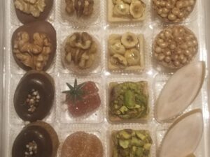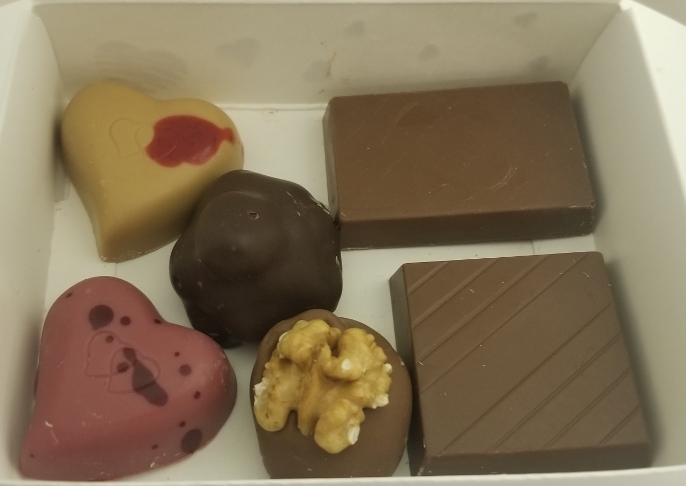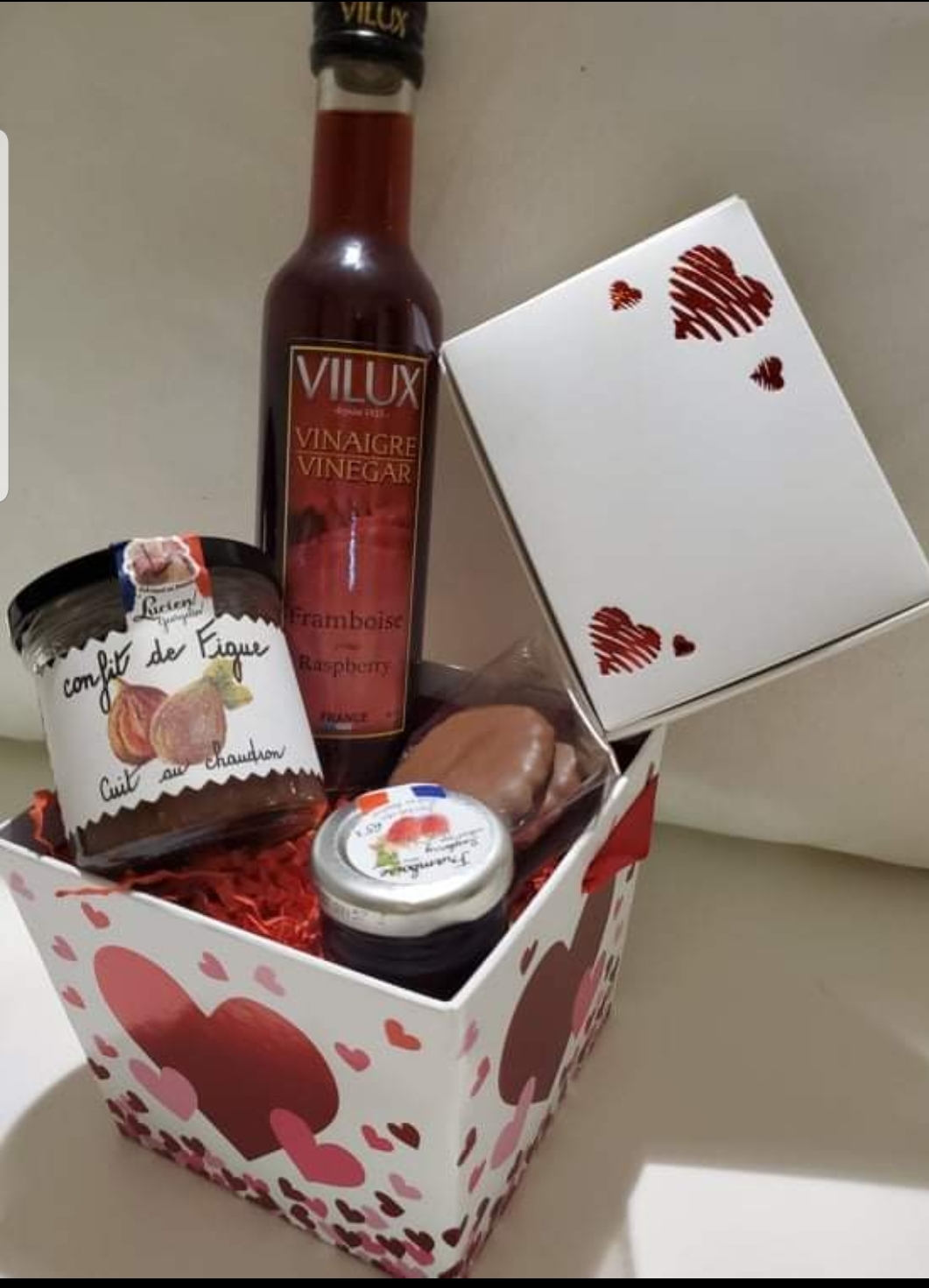 Cet assortiment est composé d’une sélection gourmande de créations: Assortiment de 6 chocolats 2 Galettes de biscuit enrobé de chocolat belge 1 Confiture de framboise 1 Confit de figue 1 Vinaigre de framboise